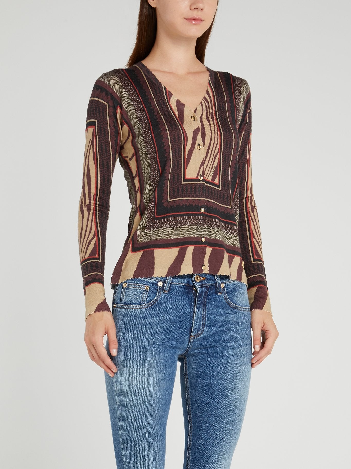The Roberto Cavalli Pattern Print Button Up Cardigan is a stunning piece that oozes sophistication and style. The perfect addition to any fashionista's wardrobe, its intricate design and luxurious fabric make it a standout choice for any occasion. Whether dressed up or down, this cardigan is sure to turn heads and make a lasting impression.